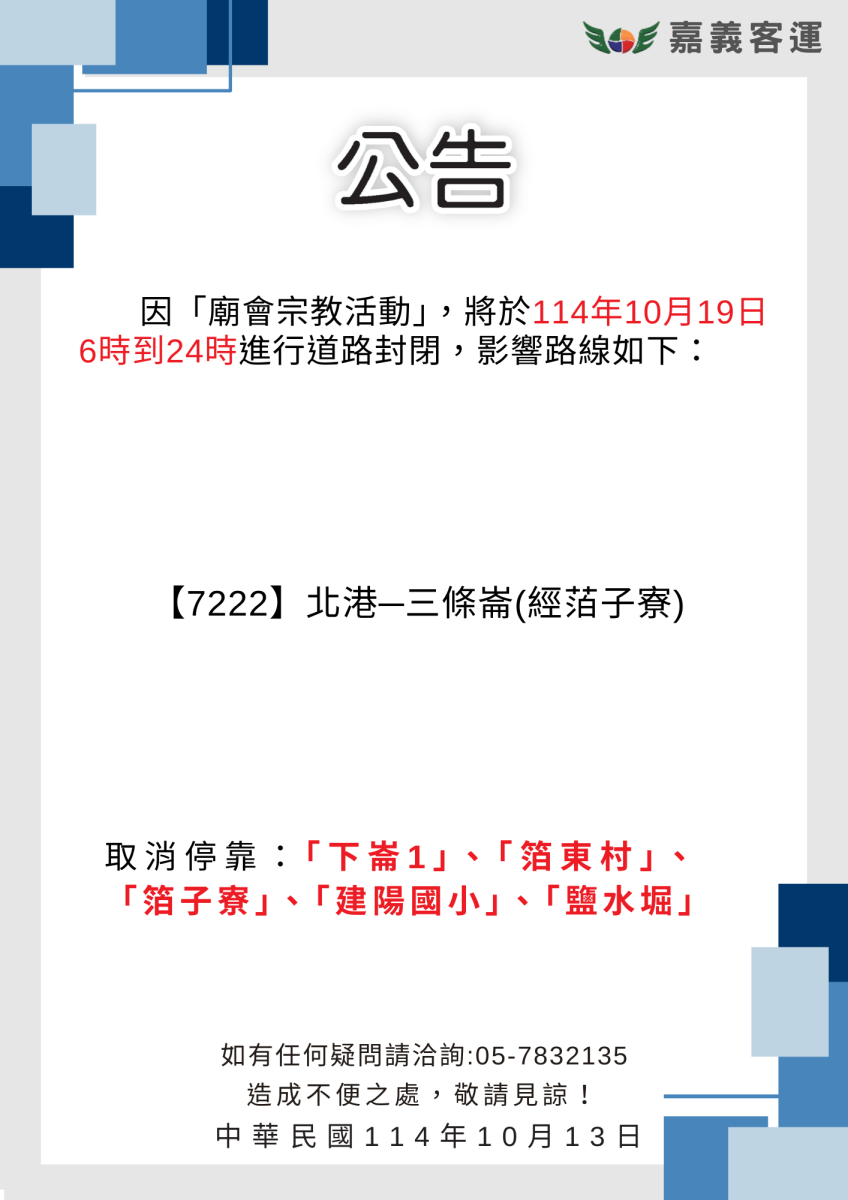 申訴專線:05-2750949 嘉義汽車客運(股)公司 地址:嘉義市後湖里忠孝一街1號 電話:05-2750895 嘉義區監理所:05-3628623 服務時間:週一至週五上午800~下午5:00 您是本站第11,468,863位訪客