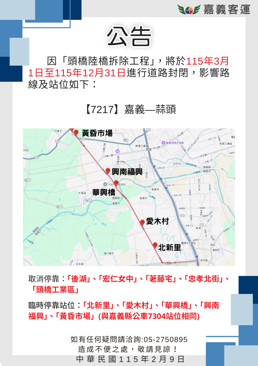 申訴專線:05-2750949 嘉義汽車客運(股)公司 地址:嘉義市後湖里忠孝一街1號 電話:05-2750895 嘉義區監理所:05-3628623 服務時間:週一至週五上午800~下午5:00 您是本站第11,672,253位訪客