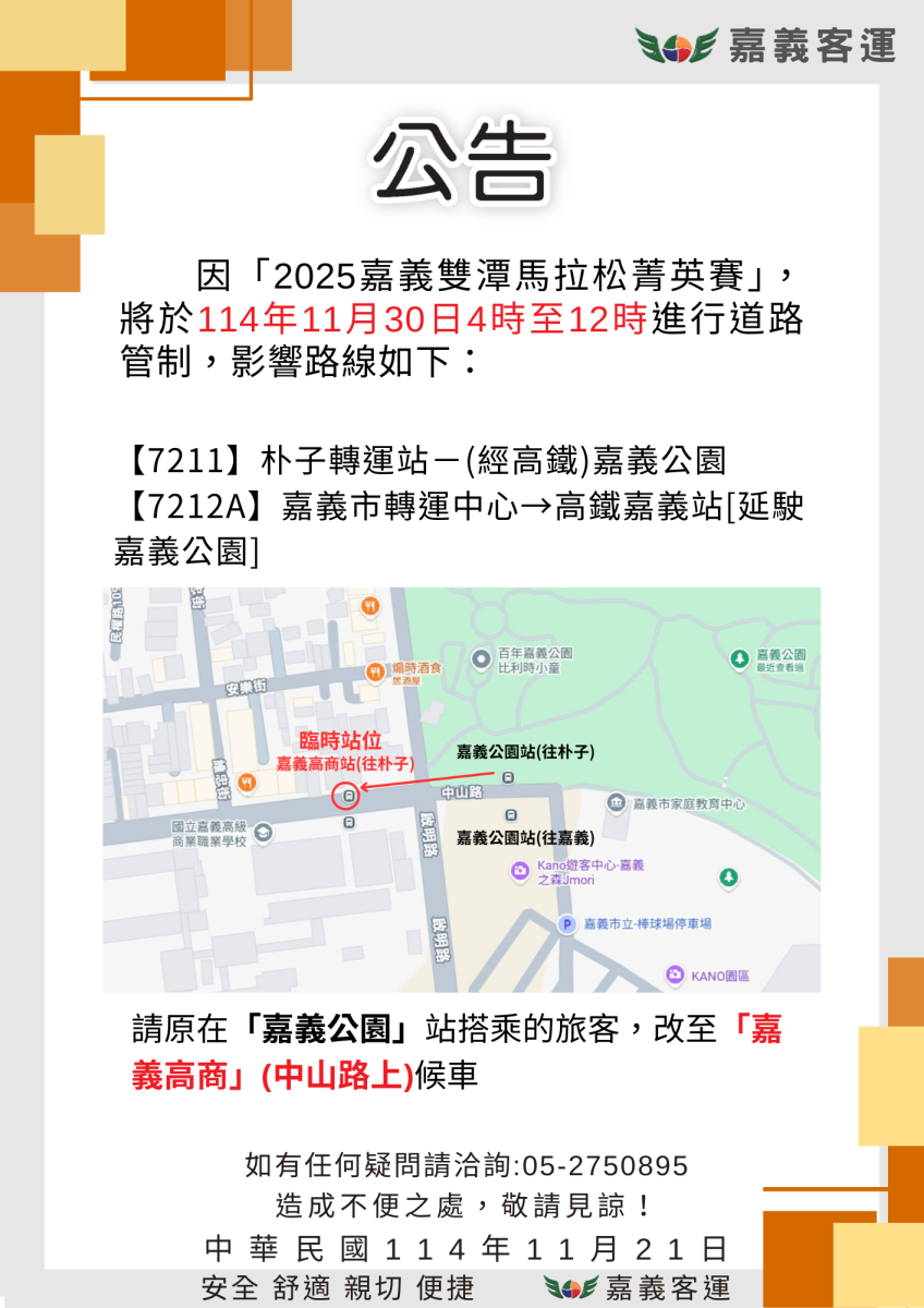 因「2025嘉義雙潭馬拉松菁英賽」,將於114年11月30日4時至12時進行道路管制,影響路線如下: