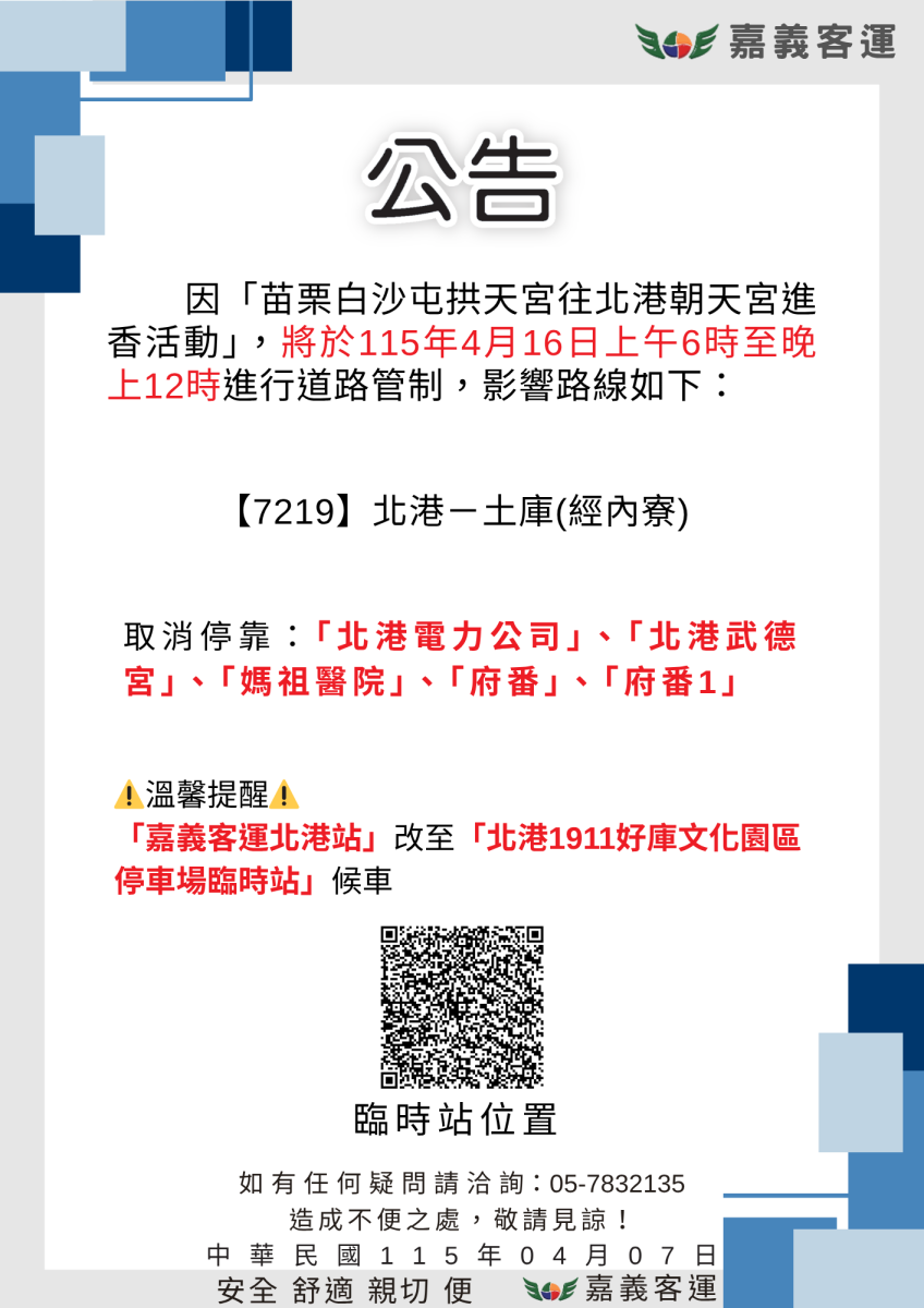 因「苗栗白沙屯拱天宮往北港朝天宮進香活動」,將於115年4月16日上午6時至晚上12時進行道路管制,影響路線如下:(北港-土庫)
