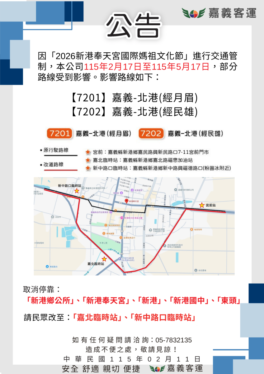 因「2026新港奉天宮國際媽祖文化節」進行交通管制,本公司115年2月17日至115年5月17日,部分路線受到影響。影響路線如下: