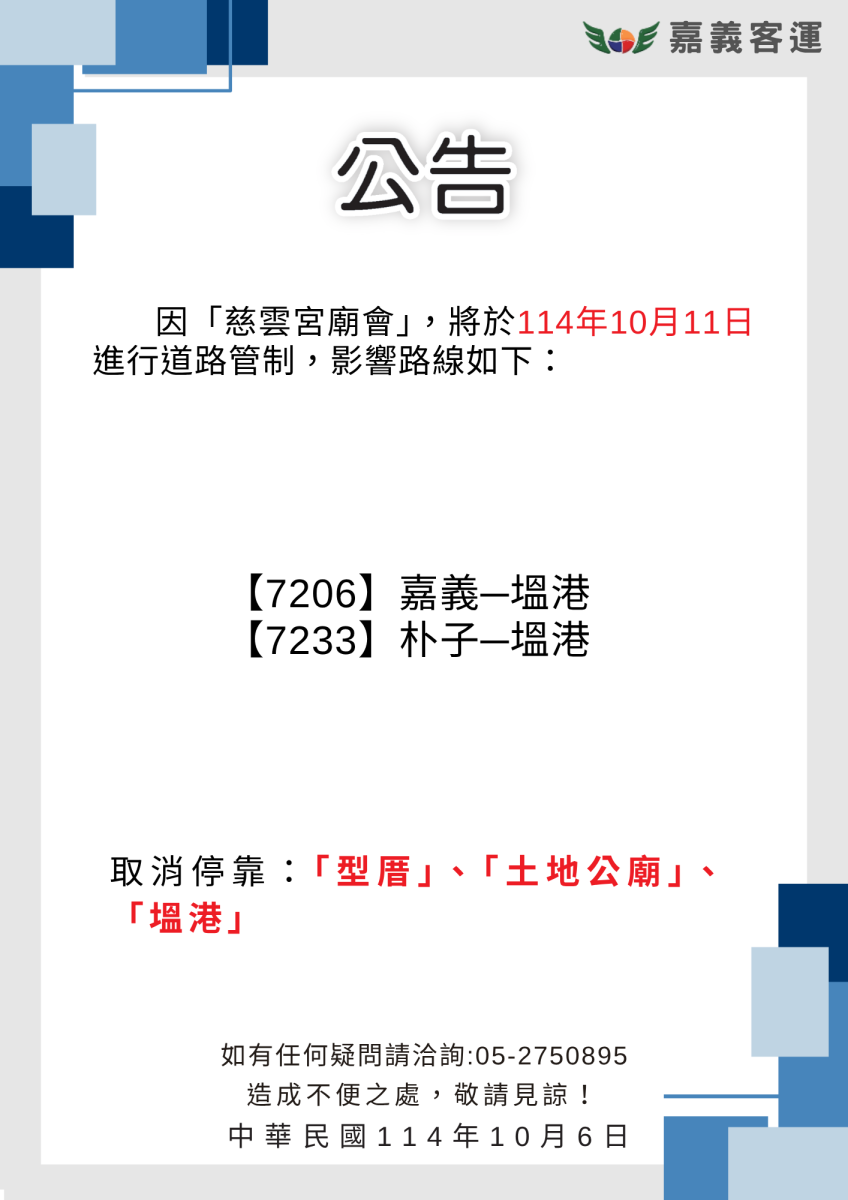 因「慈雲宮廟會」,將於114年10月11日進行道路管制,影響路線如下: