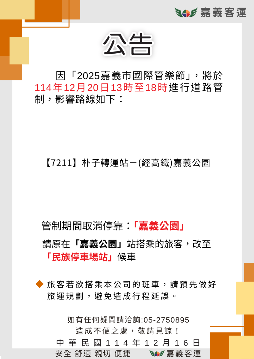 因「2025嘉義市國際管樂節」,將於114年12月20日13時至18時進行道路管制,影響路線如下: